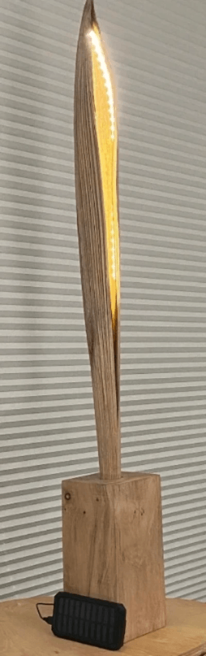 The pieces are made from remnant wood materials that were destined for the waste stream. They integrate efficient lighting and solar cells into their design. They vary in shape based on the central palm frond that informs the base and lighting chosen.