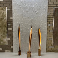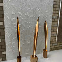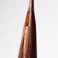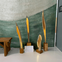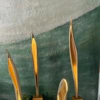 A combination of almost symmetrically curved palm fronds on a base made from a remnant piece of Ash wood. It sits over a metre tall and 35 cm wide.