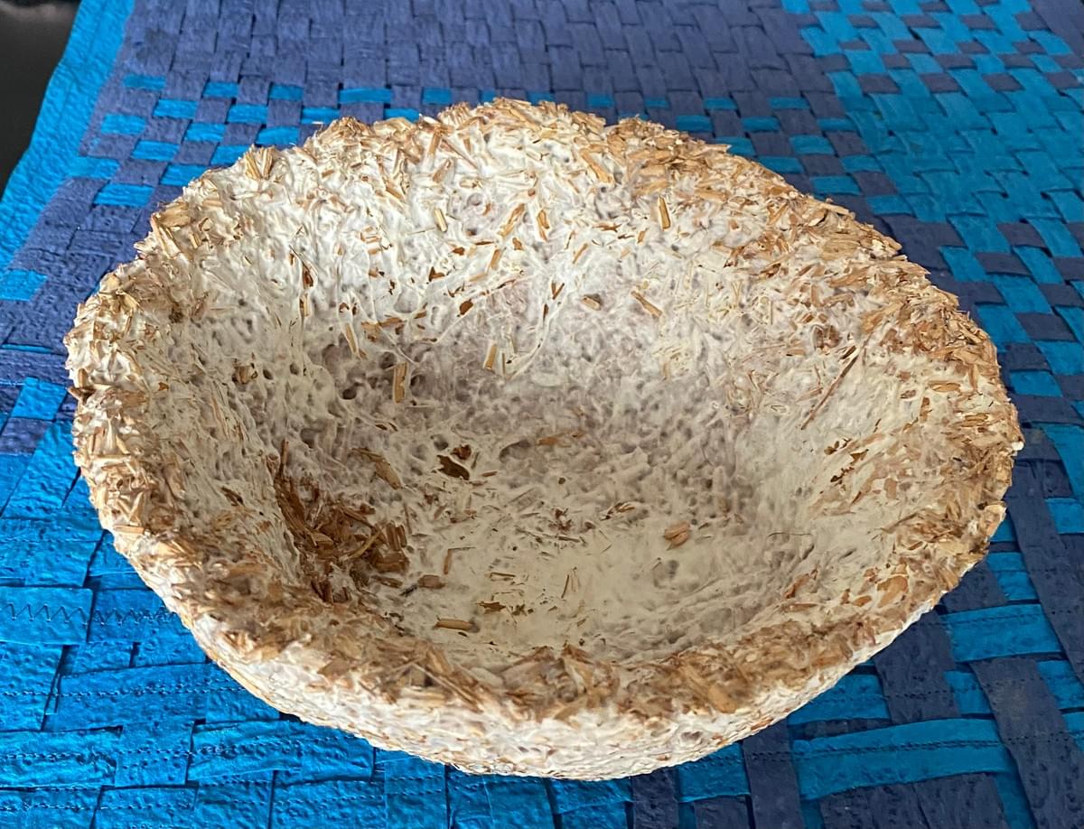 So after a false start, another attempt produced this beauty. Six weeks in a warm, dry, dark location to enable the fungi to grow, then cooked at 50 C for 4 hours to deactivate the mycelium, and this is the solid structure created. I’m looking forward to adding this to the methods Im using with post-consumer materials. This lampshade made from mycelium is a story of growth, patience and creativity.